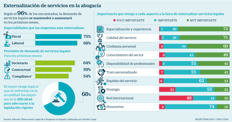 La encuesta, que recoge la opinión de casi 240 compañías en España, apunta que nueve de cada diez organizaciones creen que la demanda de servicios legales crecerá o se mantendrá a lo largo de este año. Un nivel de actividad que, no obstante, no permite a los bufetes relajar la calidad y atención que ofrecen a sus clientes, dado el contexto de alta competitividad que se ha instalado en el mercado.